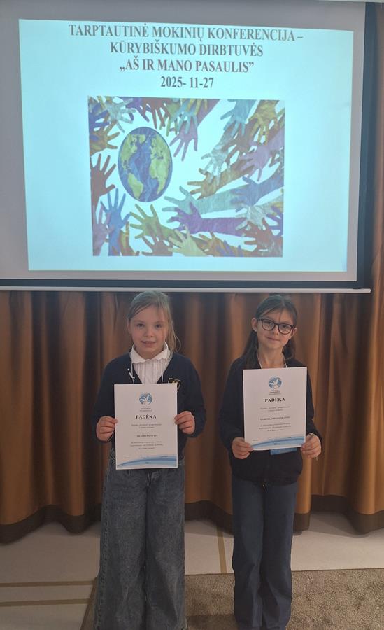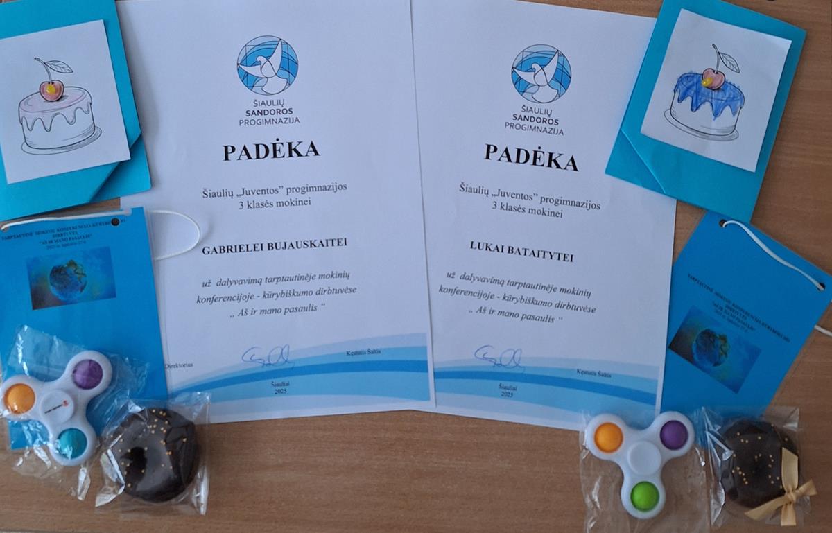2025 m. lapkričio 27 d. 3c klasės mokinės Luka Bataitytė ir Gabrielė Bujauskaitė dalyvavo tarptautinėje mokinių konferencijoje – kūrybiškumo dirbtuvėse „Aš ir mano pasaulis“, kurios vyko Šiaulių „Sandoros“ progimnazijoje.Mokiniai buvo suskirstyti į grupes pagal spalvas ir keliavo į 6 skirtingas stoteles, kuriose atliko įvairias užduotis: „Mano sėkmės istorija“, „Kūrybinių ieškojimų paslaptys“, „Muzikos ritmai“, „Šokio sūkurys“, „Aš ir inžinerija“, „Kelionė į savęs pažinimą“.Veiklos mokiniams vyko ir per nuotolį. 3a klasės mokinės Goda Zemblytė ir Anelė Krušinskaitė nuotoliu ir pristatė savo pranešimus.Konferencijos pabaigoje mokinės buvo apdovanotos padėkomis ir dovanėlėmis. Mergaitės buvo sužavėtos konferencijos – kūrybiškumo dirbtuvių veiklomis.Konferencijoje dalyvavę mokytojai stotelėje „Įtraukusis ugdymas – (ne) sėkmėsistorija Lietuvos švietimo sistemoje“ turėjo galimybę išgirsti Šiaulių „Sandoros“ progimnazijos direktoriaus pavaduotojo ugdymui Mindaugo Malcevičiaus pristatytas įžvalgas.