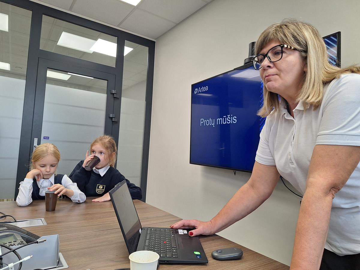 Banko darbuotoja Inga Kasiulienė supažindino vaikus su banku, iš Vilniaus banko tapusiu banku „Artea”. Iššifravome pavadinimo reikšmę.