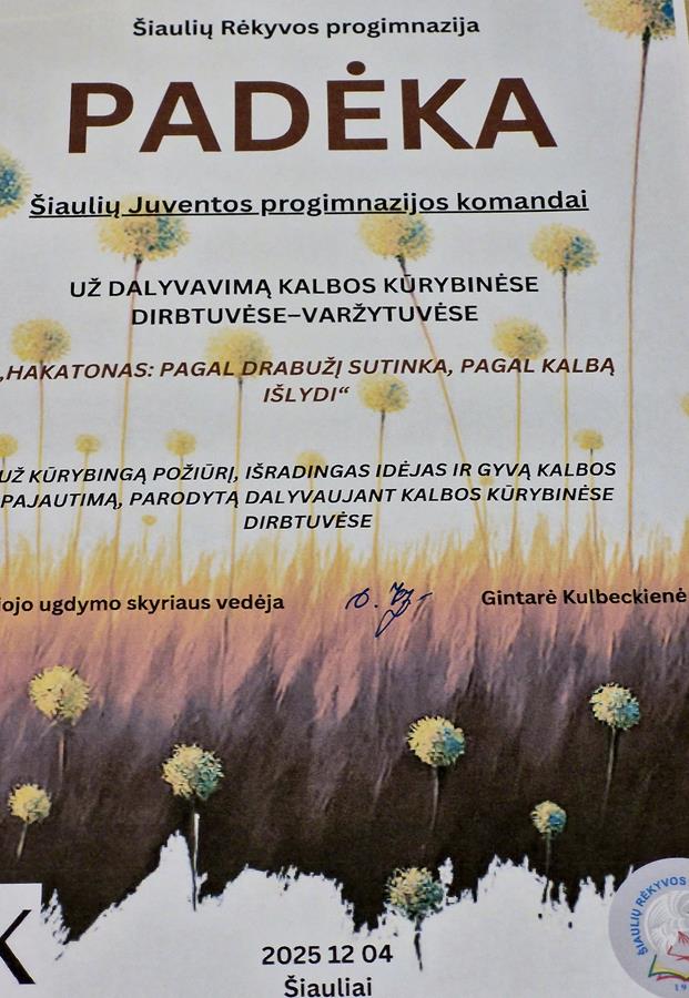 Gruodžio 4 dieną Šiaulių Rėkyvos progimnazijoje vyko projektas „Hakatonas: pagal drabužį sutinka, pagal kalbą išlydi“. Šis renginys tapo tikra švente, kurioje buvo ne tik apžvelgta įvairiapusė projekto veikla, bet ir iškilmingai atidaryta mokinių kūrybos erdvė – „Frazeologizmų siena“. Ši spalvinga erdvė – spalio 16 d. vykusių kūrybinių dirbtuvių rezultatas. Smagu, kad šioje unikalioje sienoje savo kūrybą įamžino ir mūsų – „Juventos“ progimnazijos mokiniai.