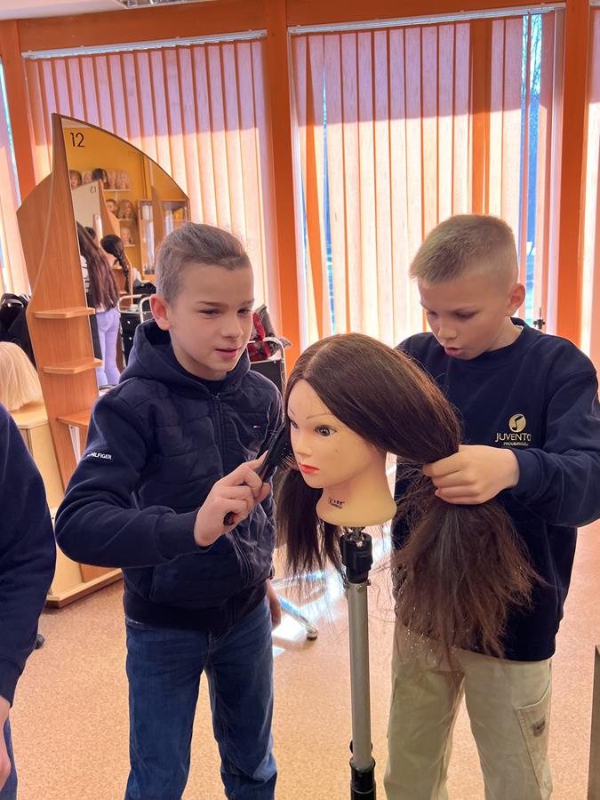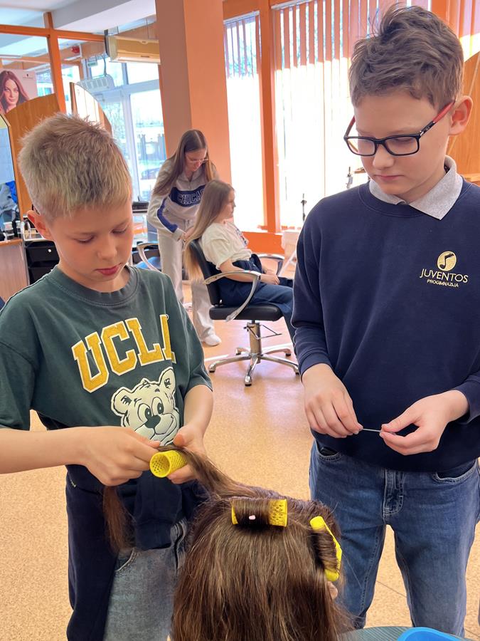 O būsimosios kirpėjos ketvirtokus papuošė gražiomis šukuosenomis. Užsiėmimas vaikams labai patiko. Ne vienas panoro ateityje tapti kirpėju arba stilistu.