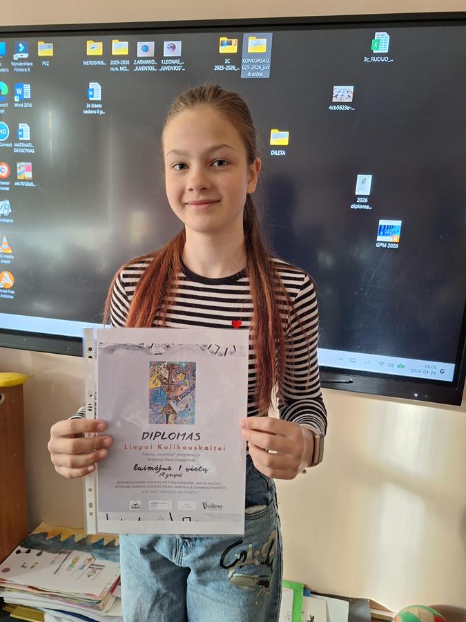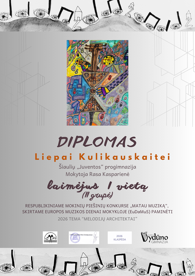 Muzikos mokytojų asociacijos puslapyje rašoma: „Metai apsuko savo laiko ratą ir vėl Jums visiems tariame ačiū, kad susitikome piešinių spalvose ir linijose. Šiais metais respublikiniame mokinių piešinių konkurse „MATAU MUZIKĄ“, skirtame Europos muzikos dienai mokykloje (EuDaMuS) paminėti, pakvietėme kurti miniatiūrą tema „Melodijų architektai“. Kūrybiškais darbais apjuosėte visą Lietuvą nuo pajūrio kopų iki Aukštaitijos ežerų.Sveikiname prizininkus ir nominacijų laureatus. Dėkojame visiems dalyviams už norą save išbandyti.Tariame ačiū Jums, Mokytojai, už puoselėjamą meno jungčių idėją, dėmesį muzikos ir dailės draugystei bei nuolatinį kūrybiškumo ieškojimą“.Su šiuo laišku mokyklą pasiekė ir informacija apie mūsų mokyklos nugalėtojus.Sveikiname LIEPĄ KULIKAUSKAITĘ (3c kl.), kuri savo amžiaus grupėje laimėji I vietą (mokyt. A. Dirginčienė).